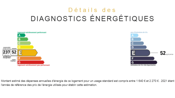 DPE E, 237 kWh/m²/an et GES E, 52 kgCO2/m²/an