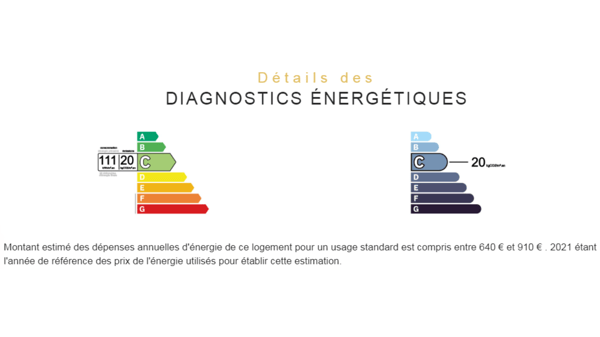 Dépenses annuelles d'énergie estimées : Entre 640,00 € et 910,00 € (prix de l'énergie de 2021)