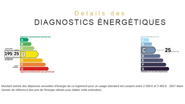 DPE : Classe D (195 kWh/m²/an) et GES Classe C (25 kgCO2/m²/an) – valeurs non actualisées pour les améliorations récentes.