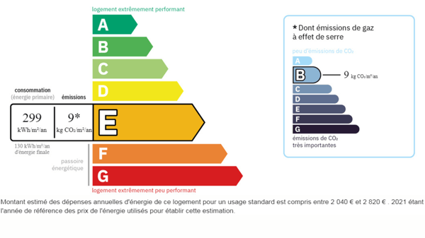 Classe énergie E (299 kWh/m2 par an) - énergie primaire (130 kWh/m² par an d'énergie finale)